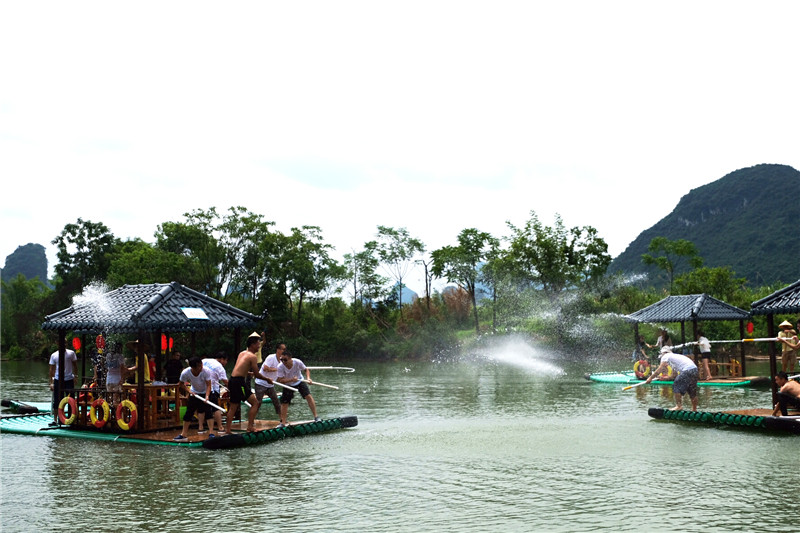 第二天,從桂林出發(fā)至陽朔,首站觀看了圖騰古道景區(qū)的石器、陶器、自然圖騰柱、古老的弓弩,學(xué)習(xí)到了充滿野性誘惑的肢體語言,領(lǐng)略到了嶺南文化的博大精深。接著來到了遇龍河,分組登上了竹筏,手持水槍,展開了激烈的水槍對戰(zhàn),大家沉浸在優(yōu)美的風(fēng)景和歡樂的氛圍里,遇龍河水面充滿了大家的歡聲笑語。最后大家來到漓江,由興坪至馬山,漓江風(fēng)光,應(yīng)接不暇,“車行碧波上,人在畫中游”,一路上兩旁的山水風(fēng)光也令大家心情激動(dòng),竹林婀娜多姿,山水相映成趣。