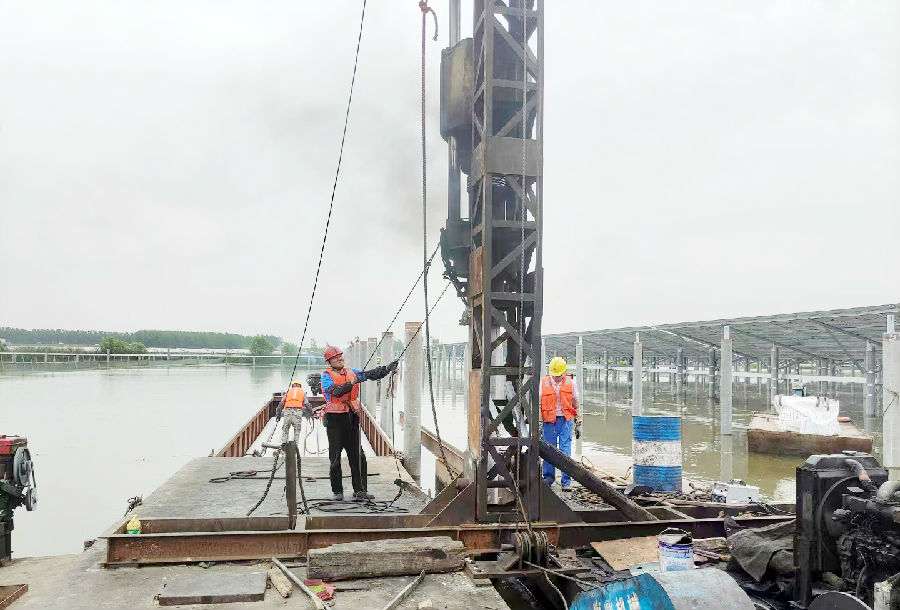 近日,在湘安新能源常德市鼎城合能新能源19.86MWp漁光互補光伏發(fā)電項目建設(shè)現(xiàn)場,大型機械來回穿梭,機聲轟鳴,施工人員頭頂烈日,正有條不紊加緊作業(yè),現(xiàn)場一派熱火朝天的施工景象。