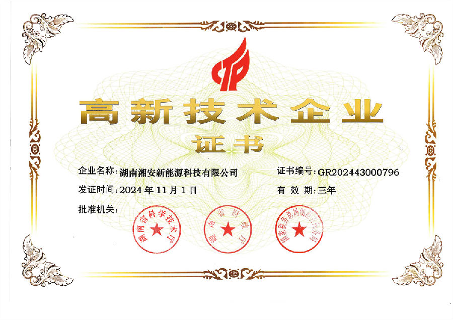 近日,湘安新能源收到湖南省科學(xué)技術(shù)廳、湖南省財(cái)政廳、國家稅務(wù)總局湖南省稅務(wù)局聯(lián)合頒發(fā)的國家高新技術(shù)企業(yè)證書及獎(jiǎng)牌(證書編號:GR202443000796),順利通過國家高新技術(shù)企業(yè)重新認(rèn)定,技術(shù)研發(fā)實(shí)力再獲“國字號”認(rèn)可。